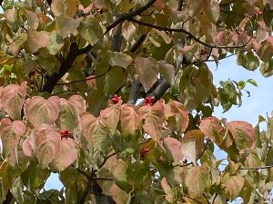 会館では、ナンテンやハナミズキの葉が薄紅色に染まり、秋の景色が広がりつつあります。