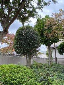 正門のイチョウ並木の間や南門のサルスベリに隣接した場所に、まあるく剪定されたキンモクセイが植えられています。