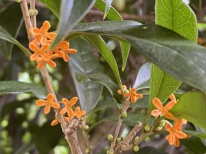 甘くてどこか懐かしい香りのする先には、無数のつぼみをつけたオレンジ色の可愛らしいキンモクセイの花を見つけることができます。
