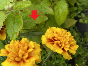 雨の日、オンブバッタがトレニアの葉の下で雨宿りをする姿にほっこり。
