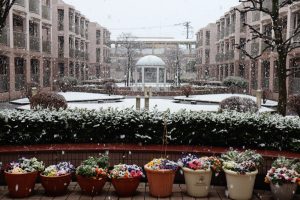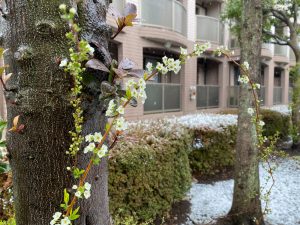 中庭の寄せ植えや樹木の上に薄っすらと雪化粧。午後には晴れ間が見え始め、あっという間に雪解けとなりました。