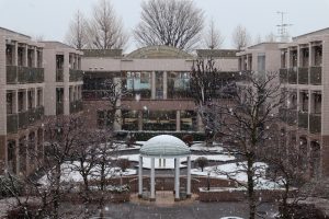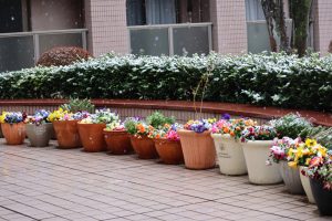 中庭の寄せ植えや樹木の上に薄っすらと雪化粧。午後には晴れ間が見え始め、あっという間に雪解けとなりました。