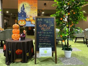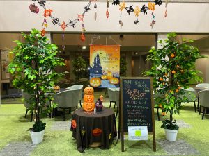 1階ロビーでは、テーブルの上にハロウィン飾りを置いてみました。陶器の小さな置物たちに心が癒されます。