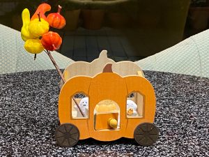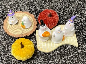 1階ロビーでは、テーブルの上にハロウィン飾りを置いてみました。陶器の小さな置物たちに心が癒されます。
