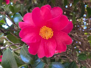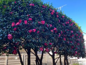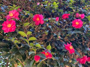 寒い日が続きますが、会館西棟側の庭のサザンカ(山茶花)は、ピンク色の花の数が日に日に増え青い空に輝いて見えます。