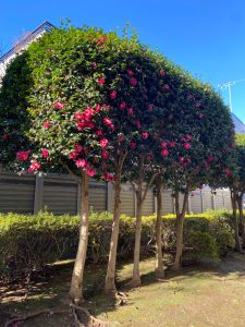寒い日が続きますが、会館西棟側の庭のサザンカ(山茶花)は、ピンク色の花の数が日に日に増え青い空に輝いて見えます。